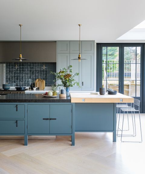 However, some find really bold blues to be too overwhelming. Peruse our gallery of trends and inspiration, from luxe stone surfaces to brass cupboards and chunky marble islands for the ultimate kitchen update. Style (and dinner) is served! Create a welcoming feel with a rustic timber table and chairs Our kitchens are following the fashion for taking surfaces to the dark side.